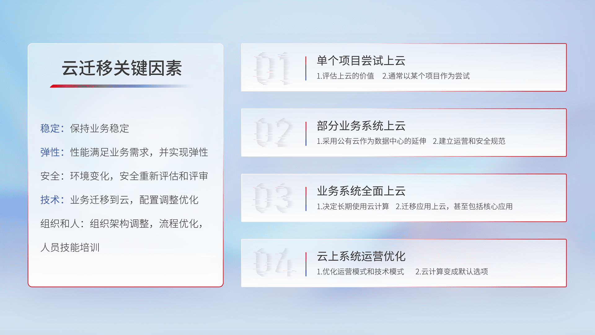 结合实际业务,,,从规划设计、、、、云平台选型、、、、云原生改造、、数据迁移、、、集成交付,,,,迁移全过程为客户识别最佳上云路径,,做好风险识别管理,,,设计网络架构、、身份权限、、、安全审计合规、、、、操作审计、、、日志审计、、、、监控告警策略、、多站点容灾设计等,,对云上基础设施进行整体规划,,,,提升IT治理水平,,,以满足弹性、、、高可用、、、、高性能的需求。。